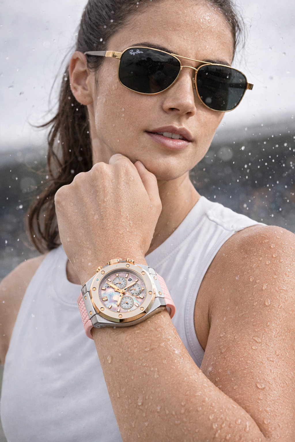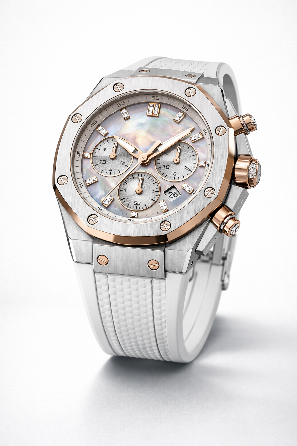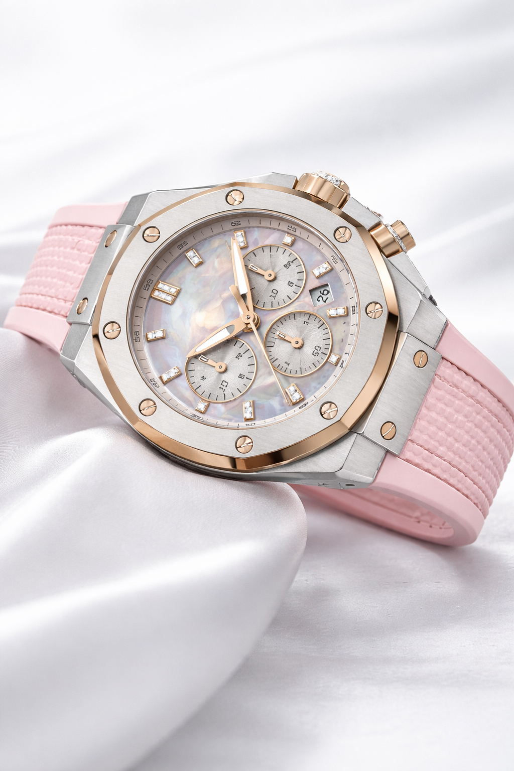 The Elite Sport Chronograph blends refined elegance with modern sport performance, designed for women who appreciate both style and function. Its luminous dial, accented with crystal markers and polished hands, creates a sophisticated look while maintaining clear, everyday readability.Special features include a fully functional chronograph, precision sub-dials, and a durable case finished with refined metallic accents. Powered by a reliable quartz movement, the watch delivers accurate timekeeping in a design that feels balanced, comfortable, and secure on the wrist.Finished with a soft sport strap and a sleek profile, the Elite Sport Chronograph offers a confident expression of contemporary luxury, making it suitable for both active days and polished occasions.